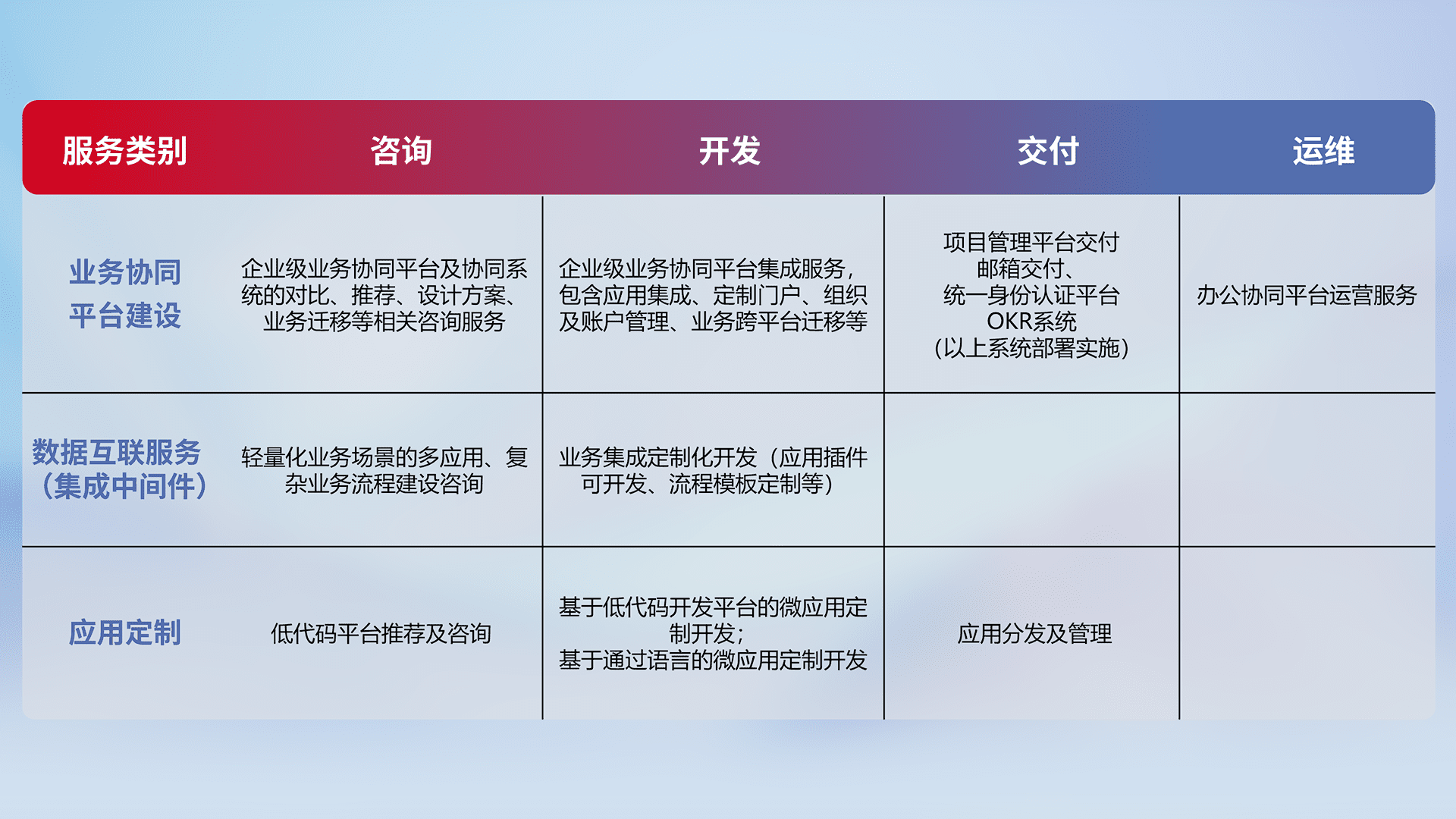 针对钉钉、、、企微、、IDaas等平台级产品提供产品的规划、、、、方案、、、、交付、、、定制化开发等服务,,,实现如统一协同办公、、智能客户服务、、、、混合会议管理、、、智能数据查询、、、、等业务场景,,,,实现数字化转型。。。。